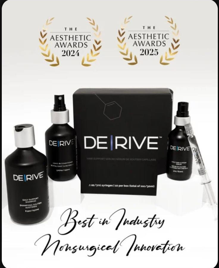 2024 and 2025 award-winning DE|RIVE treatment for best nonsurgical hair loss treatment combines exosome therapy and AquafirmeXS for painless, rapid hair restoration.
