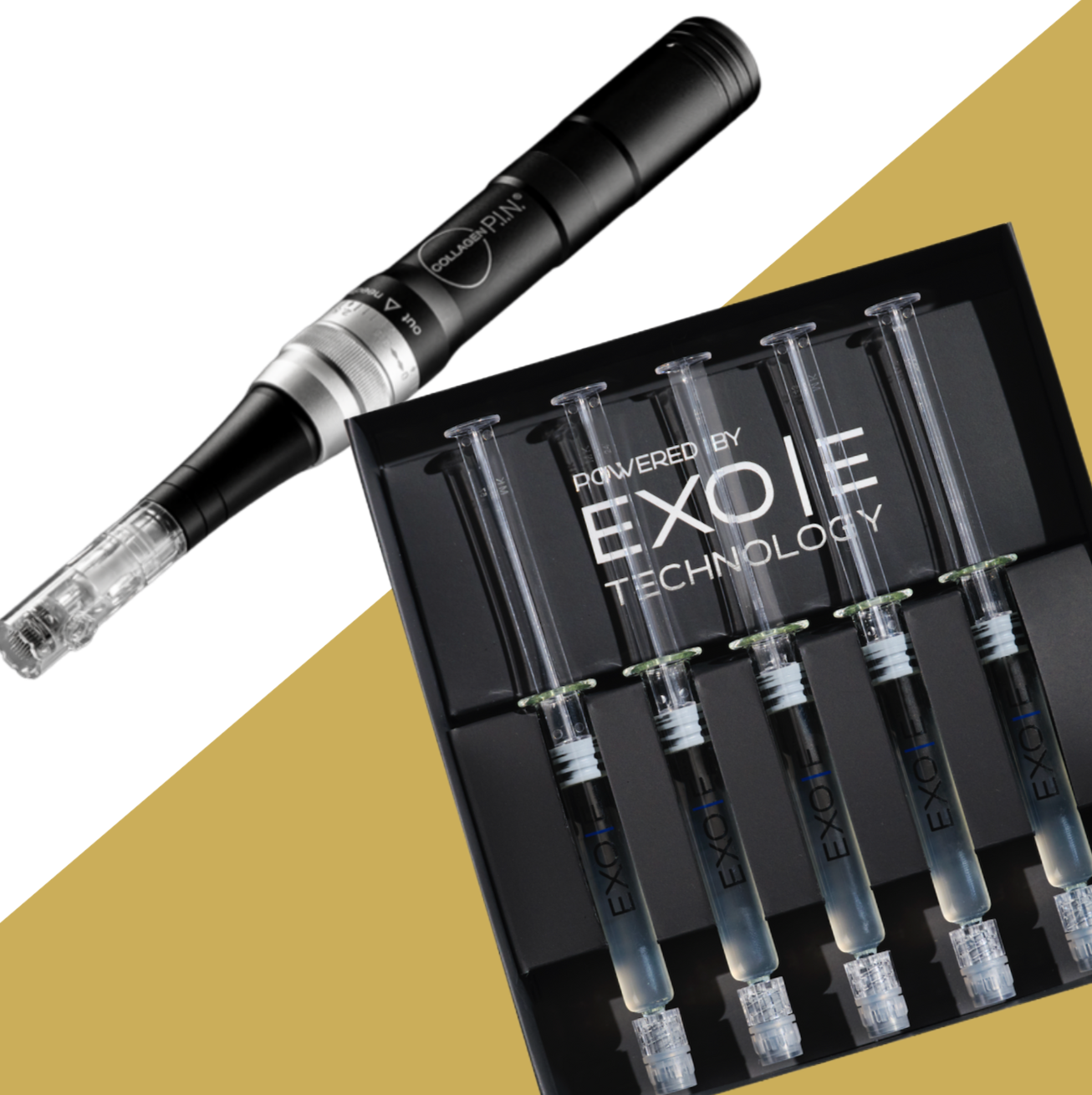 Microneedling with exosomes to stimulate collagen in the skin and improve skin texture, or for the hair targeting follicle health and hair regrowth.
