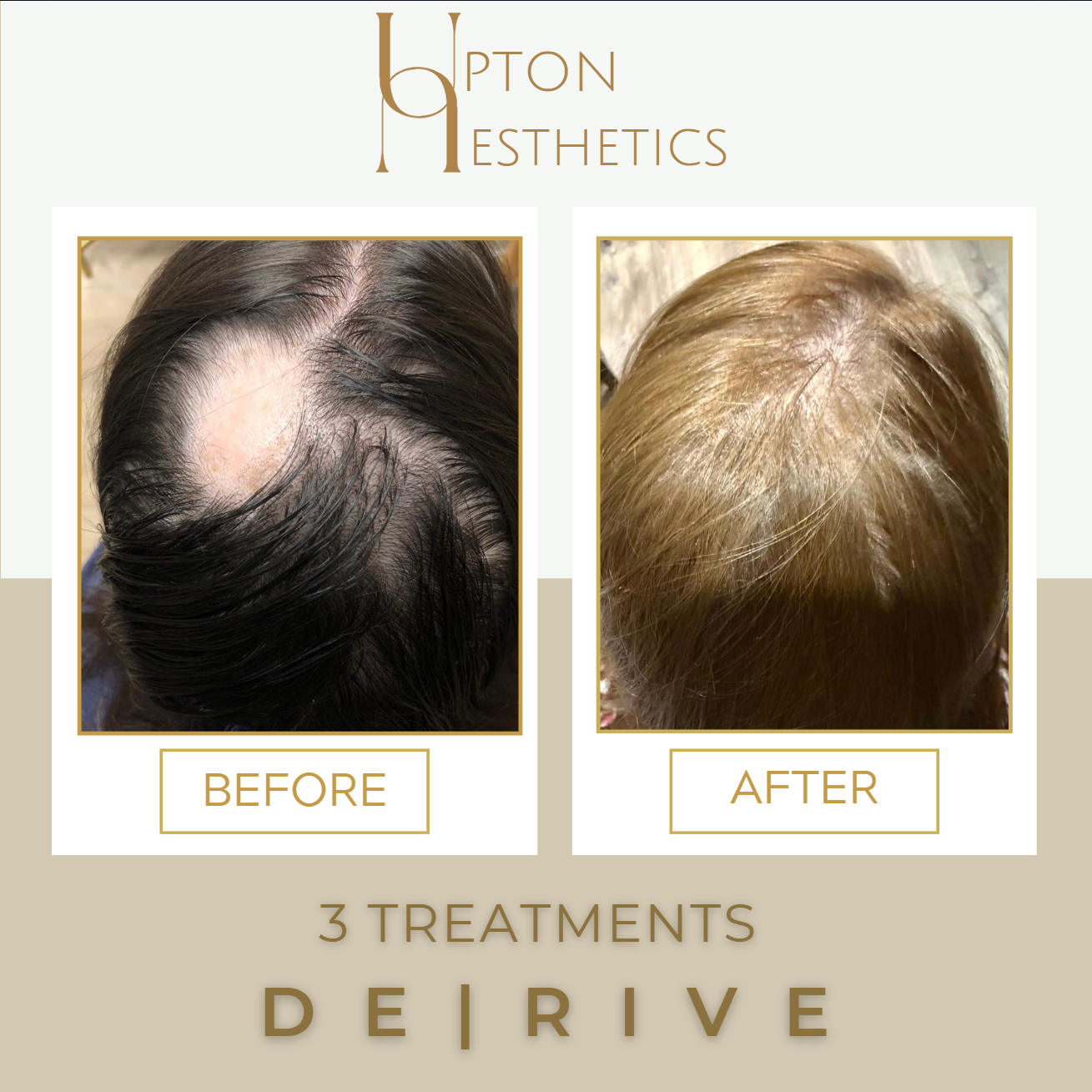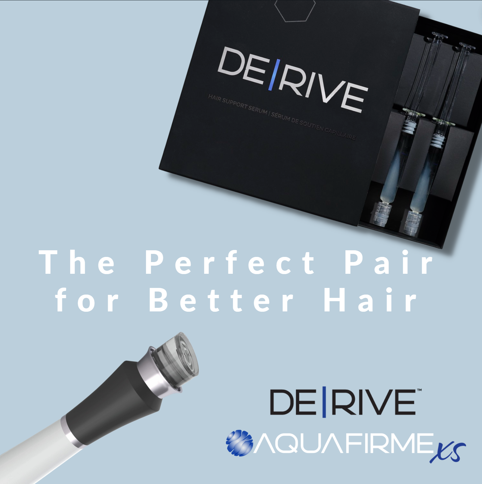DE|RIVE is applied in-office topically and can be enhanced with AquaFirmeXS & the ULTRA technology. DE|RIVE can also be combined with other in-office treatments per your provider's recommended treatment plan. The patient is sent home with a daily serum to apply morning & night after the in-office treatment and a shampoo and leave-in conditioner for added continuous care.