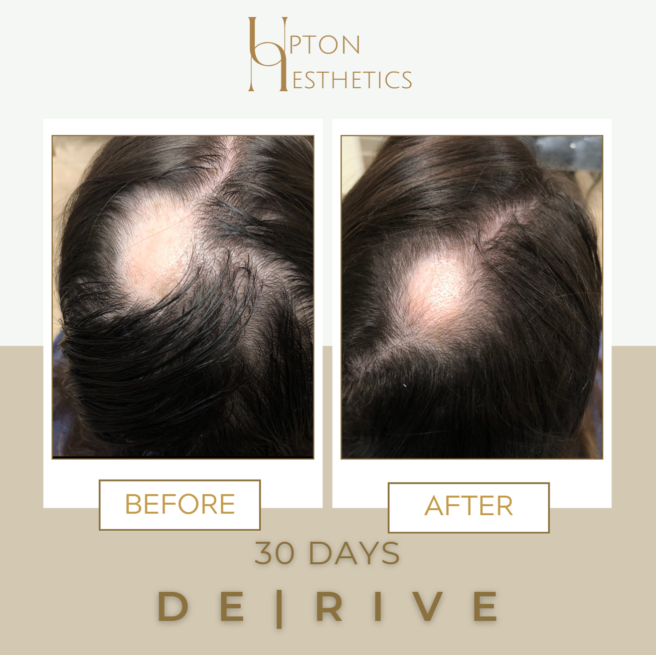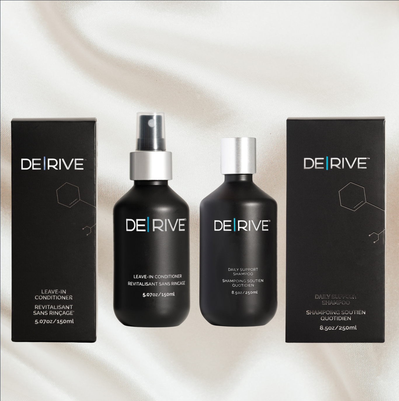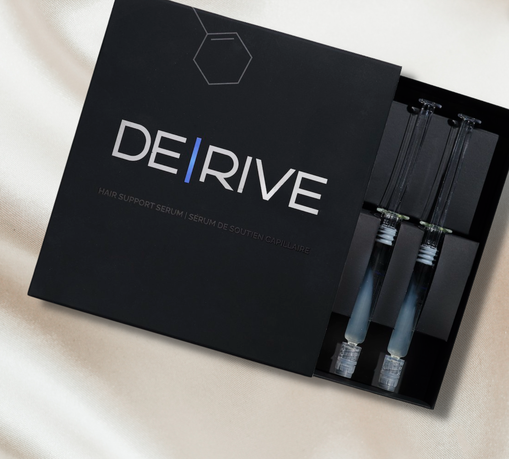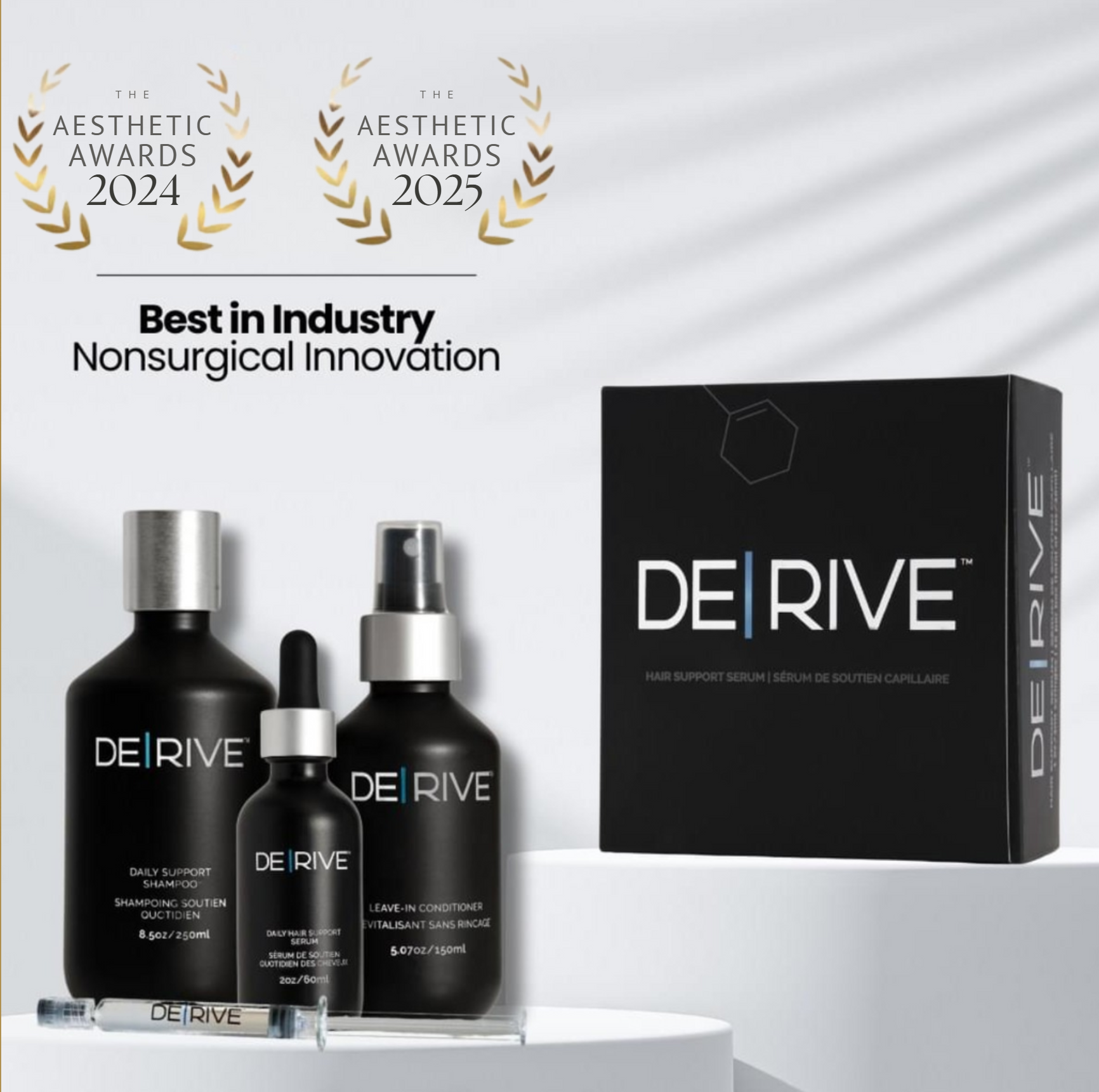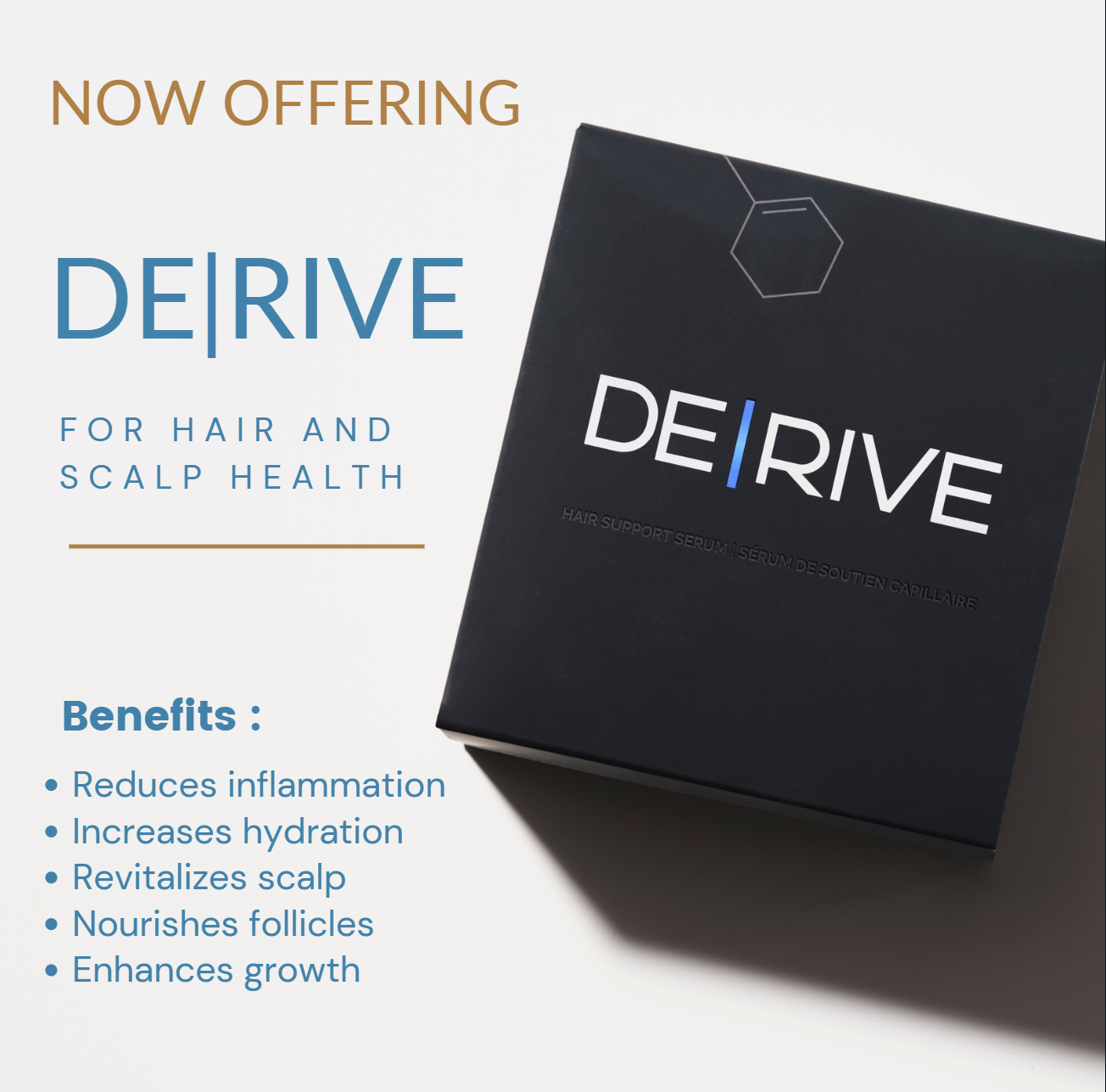 The ingredients of the DE|RIVE line of products have been well studied with over 23 medical publications. DE|RIVE consists of an in-office formulation, the Daily Support Serum, as well as a specifically formulated Shampoo and Leave-in Conditioner to help support your daily regimen for scalp and hair health.