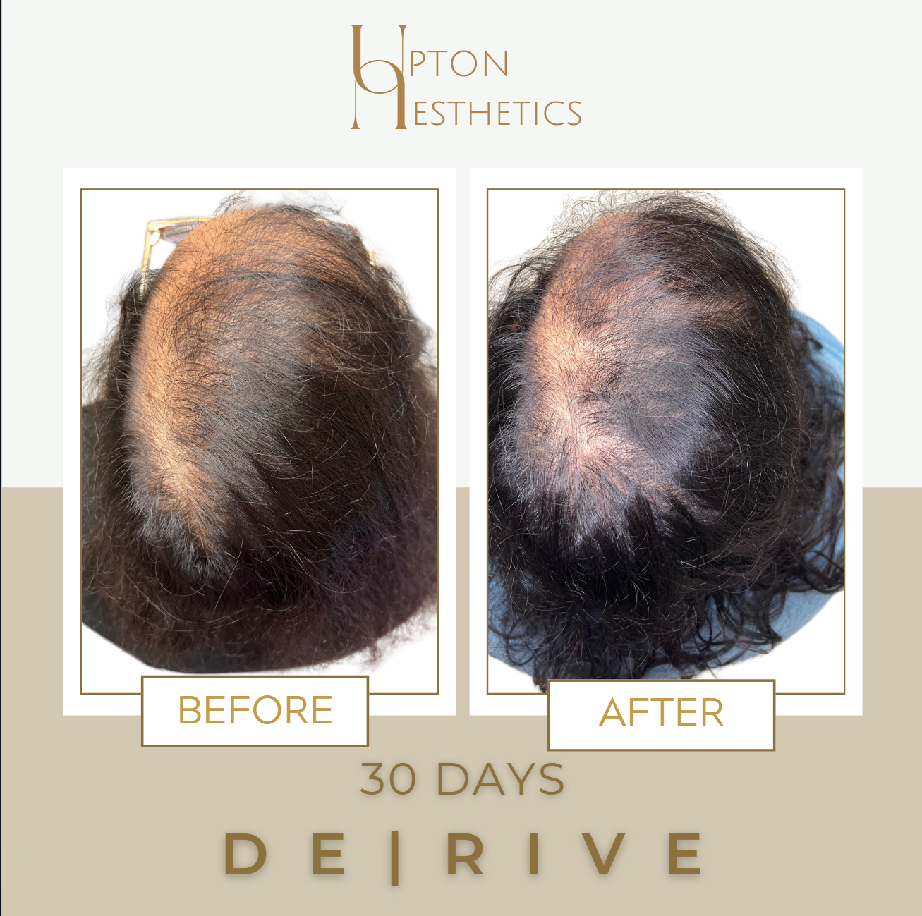 Upton Aesthetics elevates your DE|RIVE results by combining treatments with AquafirmeXS detox serum, ultrasound technology, and red light therapy for an enhanced effectiveness of the DE|RIVE hair wellness system. To combat inflammation and promote circulation and follicle growth.